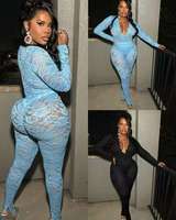 Conjunto informal de 2 piezas para mujer, mono de malla de encaje Jacquard bordado, + Leggings Tops, cuello en V profundo para actividades de Club de medianoche